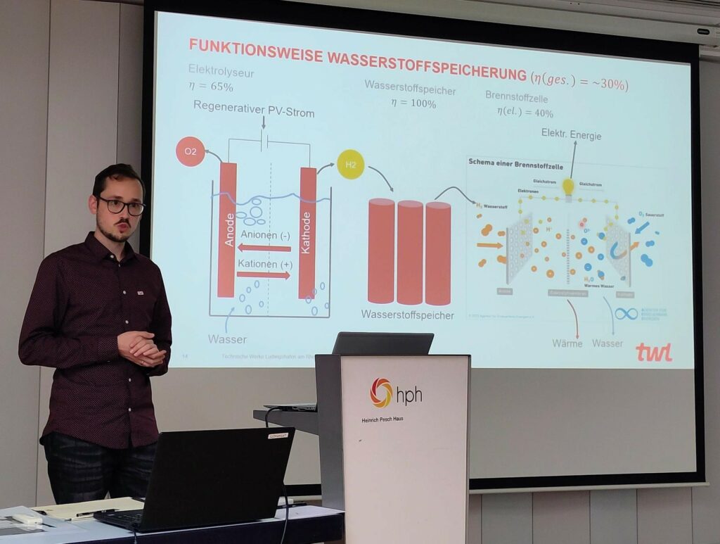 Zoltan Meszaros und Dominik Baumann von der TWL – Technische Werke Ludwigshafen am Rhein AG sowie Alexander Mack (Referent für sozial-ökologische Transformation im Heinrich Pesch Haus) führten die interessierten Teilnehmenden durch die Veranstaltung. Zoltan Meszaros und Dominik Baumann erläuterten zunächst unter anderem die Unterschiede von blauem, grünem und grauem Wasserstoff und die Funktionsweise der Anlage.